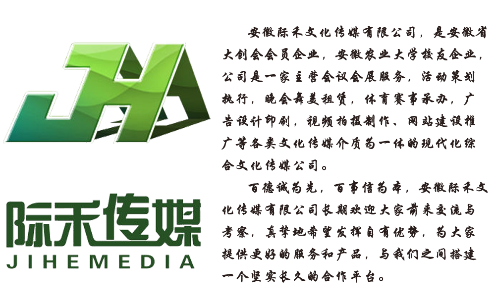 安徽際禾文化傳媒有限公司,注冊(cè)資本500萬元,安徽省科技廳認(rèn)定科技型中小企業(yè),安徽省青年企業(yè)家協(xié)會(huì)會(huì)員單位,安徽省大學(xué)生創(chuàng)新創(chuàng)業(yè)促進(jìn)會(huì)理事單位,蚌埠市青年企業(yè)家協(xié)會(huì)常務(wù)理事單位,公司是一家主營(yíng)會(huì)議會(huì)展服務(wù),活動(dòng)策劃執(zhí)行,晚會(huì)舞美租賃,體育賽事承辦,廣告設(shè)計(jì)印刷,視頻拍攝制作、網(wǎng)站建設(shè)推廣等各類文化傳媒介質(zhì)為一體的現(xiàn)代化綜合文化傳媒公司。百德誠(chéng)為先,百事信為本,安徽際禾文化傳媒有限公司長(zhǎng)期歡迎大家前來交流與考察,真摯地希望發(fā)揮自有優(yōu)勢(shì),為大家提供更好...
